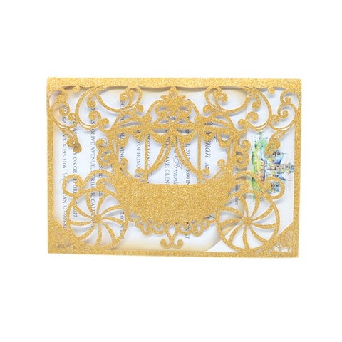 Cubierta de invitación de boda con purpurina cortada con láser de Cenicienta dorada