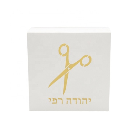 Tijeras de corte láser con texto hebreo personalizado en blanco, caja de regalo Upsherin para decoración de fiesta judía de 3 años